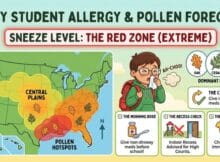 The Daily “Sneeze Prediction”: A massive “pollen explosion” is surging northward today, triggering high “Allergy Brain Fog” and significant asthma risks for students as tree pollen levels reach